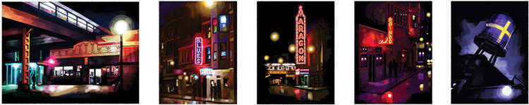 My series is called Chicago Night and I create paintings of Chicago diners, bars, clubs, theaters, el trains, etc. all at night. I sell prints of the paintings as multiple sized archival paper prints, mounted woodblocks and canvases. A traditional painter for years, I create this series digitally on an iPad using my finger as a brush from sketch to final print.