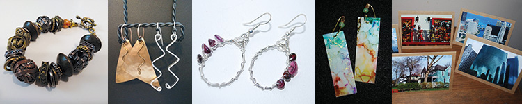 We create fabric earrings, button earrings, cowls, headbands, and clutches.